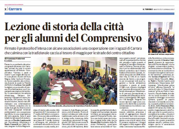 Le associazioni: Accademia Albericiana, Dickens Fellowship, I Giovani al Centro, Italia Nostra, Cif Carrara, Ccn Carrara del marmo, hanno così ufficializzato una collaborazione con l´Istituto scolastico che in realtà dura già da diversi anni e che vede impegnati volontari professionisti con competenze specifiche, in una cooperazione del tutto gratuita. Sono 6 anni infatti che gli esperti di storia locale tra cui Davide Lambruschi per l´Accademia Albericiana e Mario Venutelli per Italia Nostra, tengono in Aula Magna lezione di storia sulla nostra città ai bambini di 5° elementare e di 1° media dell´istituto comprensivo.
